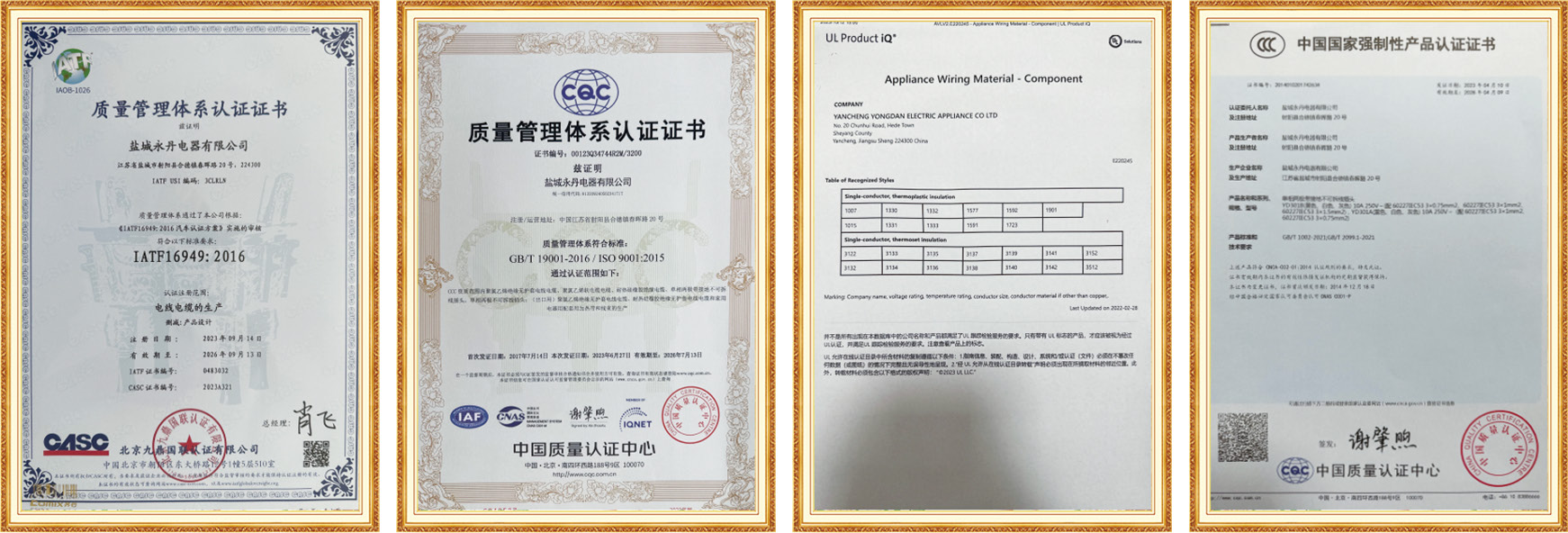 主要产品分别通过了美国UL安全认证、中国质量认证中心“3C”强制产品认证以及德国VDE认证。电加热产品通过了国家电线电缆质量认证中心检测。产品全部通过“SGS”环保和RoHS & Reach检测。
